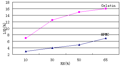 含水量低——比明膠空心膠囊低約60% 明膠空心膠囊的含水量一般為12.5%-17.5%[10]。無(wú)論在空心膠囊生產(chǎn)、運(yùn)輸、使用以及保存的過(guò)程中都應(yīng)把環(huán)境的溫、濕度控制在一個(gè)合適的范圍內(nèi)。合適的溫度為15-25℃,相對(duì)濕度為35%-65%,這樣方可長(zhǎng)期保持產(chǎn)品的性能。HPMC膜所含的水分很低,一般為4%-5%,比明膠空心膠囊的含水量低約60%(Fig 1.)。 在長(zhǎng)期儲(chǔ)存時(shí)與環(huán)境中的水分交換,會(huì)使HPMC空心膠囊在規(guī)定包裝中的含水量有所升高,但5年內(nèi)不會(huì)超過(guò)9%。 Fig1. LOD comparison of HMPC and Gelatin shells in under different RH