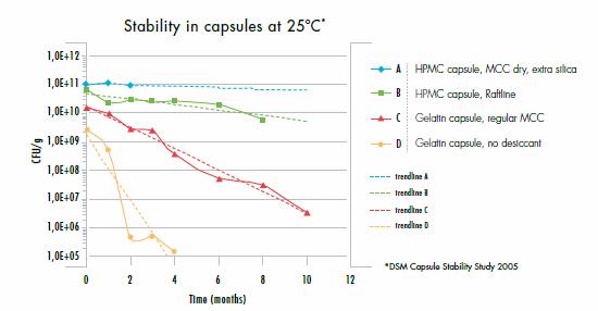 含水量低的特點(diǎn)使得HPMC空心膠囊適合于吸濕性或水分敏感性內(nèi)容物的填充,以延長(zhǎng)產(chǎn)品的保質(zhì)期。 DSM營(yíng)養(yǎng)品公司2005年的一項(xiàng)研究中,比較了HPMC空心膠囊(Vcaps®)和明膠空心膠囊對(duì)益生菌(Lafti® L-10嗜酸乳桿菌)穩(wěn)定性的影響。益生菌是一類活的微生物,口服足夠數(shù)量的益生菌能夠改善宿主腸道微生物的平衡,用于治療腸道疾病,通常認(rèn)為僅有活菌才能產(chǎn)生益生功能。然而,益生菌對(duì)水分非常敏感,過(guò)多的水分會(huì)導(dǎo)致活菌的死亡[12]。DSM在不同的濕度下將Lafti® L -10及輔料充填入HPMC膠囊和明膠空心膠囊,并考察其穩(wěn)定性。結(jié)果表明,與明膠空心膠囊相比,HPMC空心膠囊能夠較好地保持產(chǎn)品的活菌數(shù)量,并延長(zhǎng)益生菌產(chǎn)品的效期(Fig 2.) Fig2. Stability comparison of HPMC and gelatin shells in probiotic products