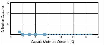 高韌性,無(wú)脆碎 上文提到,明膠膜有規(guī)定的水分含量,如果低于這一限度,明膠膜會(huì)發(fā)生明顯的脆碎。無(wú)任何添加物的普通明膠空心膠囊在水分含量為10%時(shí),即有10%以上的脆碎風(fēng)險(xiǎn);當(dāng)水分持續(xù)降低至5%時(shí),則會(huì)出現(xiàn)100%的脆碎。相比而言,HPMC空心膠囊的韌性要好得多,即使環(huán)境濕度低,也保持良好的性能(Fig 3)。當(dāng)然,不同處方的HPMC空心膠囊在低濕度下的脆碎發(fā)生率會(huì)呈現(xiàn)較大差異。 Fig3. Flexibility at different moisture level