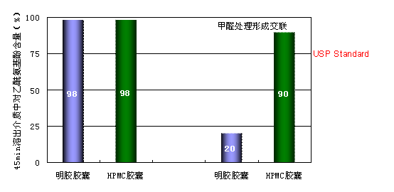 化學(xué)穩(wěn)定性強(qiáng) 明膠膠囊的交聯(lián)反應(yīng)是膠囊制劑遇到的棘手問(wèn)題。由于內(nèi)容物的醛基與明膠中氨基酸的氨基發(fā)生反應(yīng)形成網(wǎng)狀結(jié)構(gòu),造成囊殼在體外溶出條件下難以溶解,從而影響藥物的釋放。羥丙甲纖維素是一種纖維素衍生物,化學(xué)惰性,與大多數(shù)物質(zhì)相容性極好,因此HPMC空心膠囊沒(méi)有交聯(lián)反應(yīng)的風(fēng)險(xiǎn),化學(xué)穩(wěn)定性較高(Fig4)。 Fig 4. Dissolution comparison of HPMC and Gelatin shells under stressed conditions