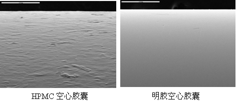 良好的包衣性能 腸溶膠囊應(yīng)用于易遭胃酸破壞、對(duì)胃粘膜刺激性或需靶向給藥的藥物。國(guó)際上通行的腸溶膠囊劑工藝為腸溶微丸和膠囊整體包衣。HPMC空心膠囊在膠囊整體包衣上顯示出獨(dú)特的優(yōu)勢(shì)。 研究表明,由于HPMC空心膠囊的表面較為粗糙(Fig 5),與大多數(shù)腸溶包衣材料的親和力明顯高于明膠,包衣材料附著的速度和均勻度明顯優(yōu)于明膠,尤其是體帽結(jié)合部包衣的可靠性顯著提高。體外溶出度檢測(cè)顯示HPMC膠囊包衣后胃內(nèi)的滲透率更低,在腸道中有良好的釋放[13]。 Fig5. Scanning electron micrographs of the surface of HPMC and gelatin capsules