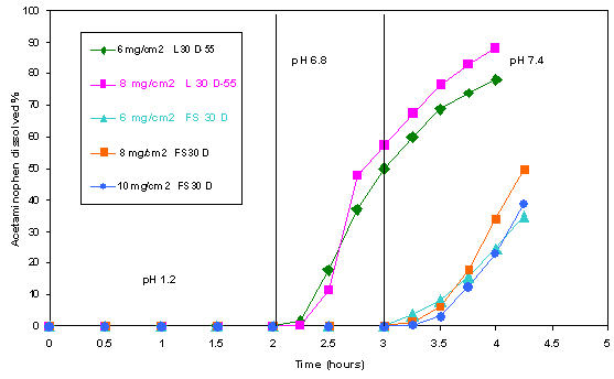 HPMC空心膠囊 明膠空心膠囊 Fig 6.Dissolution of paracetamol from HPMC capsules coated with Eudragit® L30D-55 and Eudragit® FS 30 D. N=3